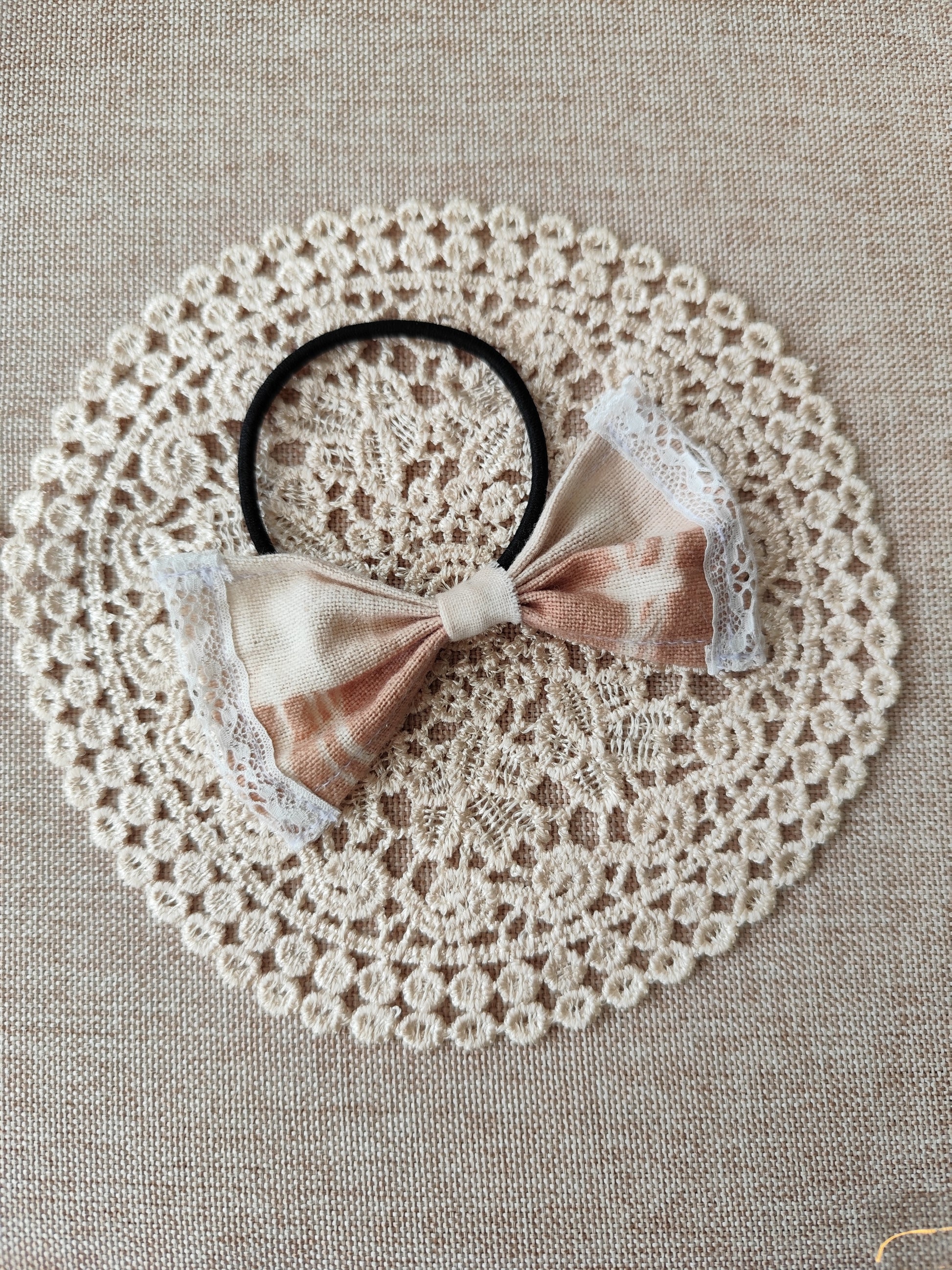 無農薬のびわの葉の草木染めで染めたオーガニックコットン100%の生地を使ったリボンのヘアアクセサリーです。すべて手作業で作っています。