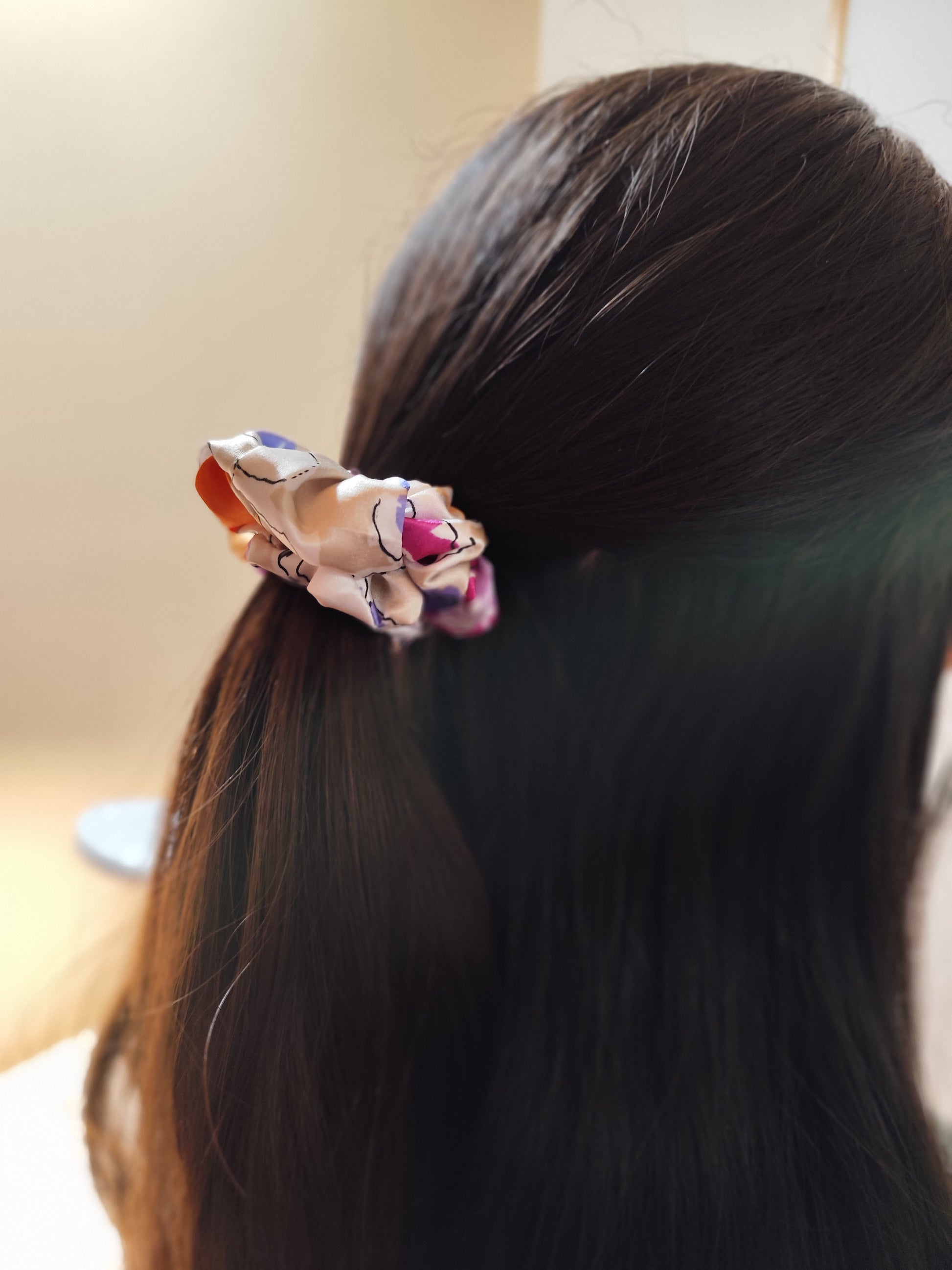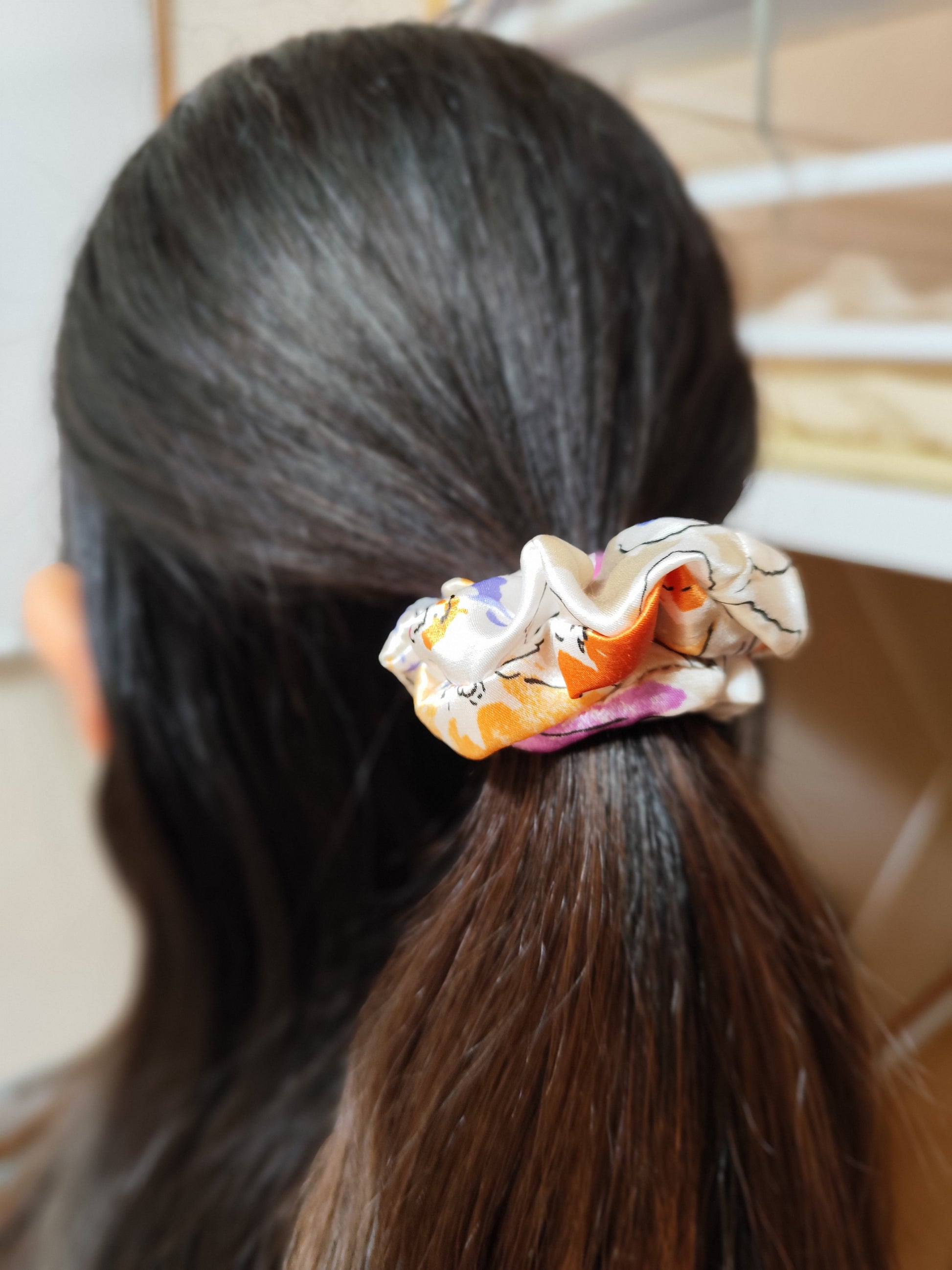 シルクの光沢感とコットンの柔らかさを両方楽しめるシュシュになってます!